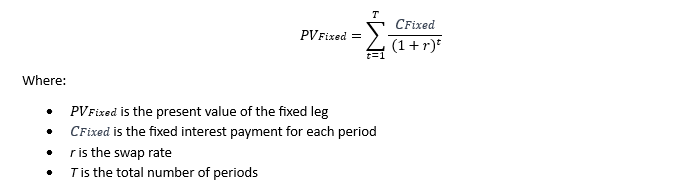 The formula calculates the present value of each fixed interest payment over the life of the swap, discounted at the swap rate. The sum of these present values represents the total present value of the fixed leg.