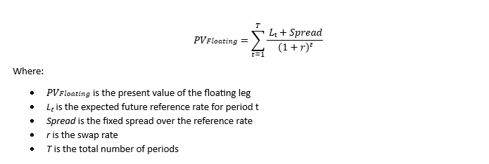 For the floating leg (assuming payments are based on a reference rate plus a spread), the present value formula is more complex due to the variability in the cash flows. It involves projecting future cash flows based on expected future reference rates and discounting them to their present value. The formula for the present value of the floating leg can be expressed as: